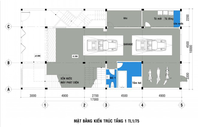 KTS Phạm Ngọc Thiên Ân đưa ra giải pháp dựa trên hình ảnh 3D như sau: Tầng một làm garage cho xe hơi, xe máy, phòng tắm và xông hơi.