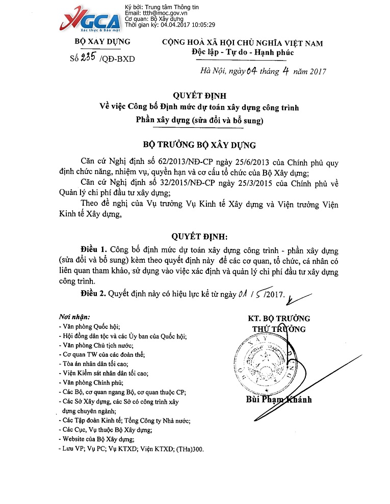 | Trích yếu | Quyết định số 235/QĐ-BXD ngày 04/4/2017 của Bộ Xây dựng về việc công bố ĐỊnh mức dự toán xây dựng công trình - Phần xây dựng (sửa đổi và bổ sung) |